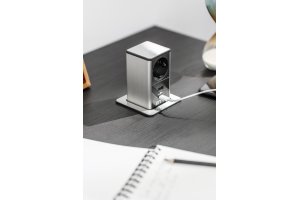 Výsuvná nábytková elektrická zásuvka Tower v sobě propojuje funkčnost a eleganci. Kompaktní rozměry jsou při montáži ukryty pod povrchem. V zasunuté poloze je přiznaný pouze elegantní kryt. Pro vysunutí zásuvky je nutné pouze zmáčknout čtverec uvnitř. Praktická kombinace elektrické zásuvky, USB zásuvky a funkce fast charge univerzálně uspokojí všechny potřeby. Osvědčí se doma, v kanceláři nebo ve veřejných prostorech a poskytne výhody v nejlepším možném stylu.