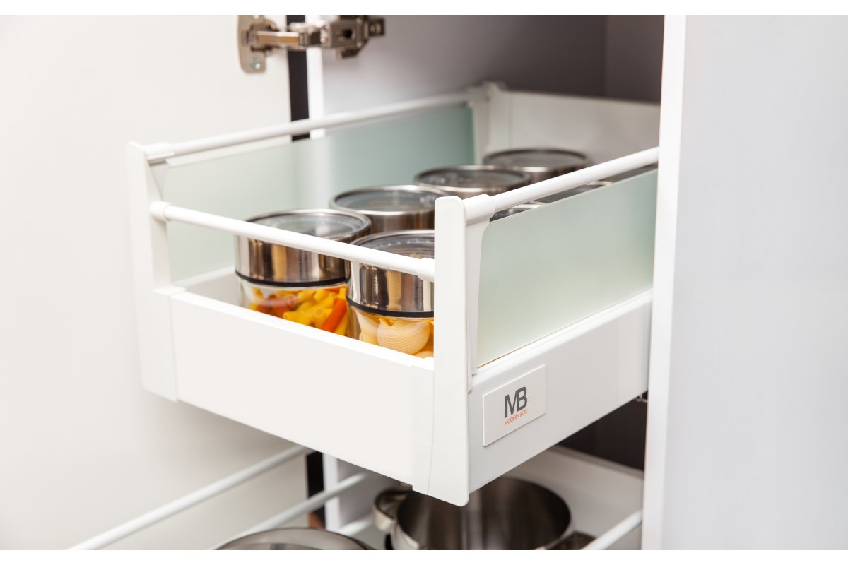 Podélná lišta pro zásuvky Modern Box z oceli, k dispozici ve dvou barevných variantách. Výrobek zvyšuje funkčnost a stabilitu zásuvky.