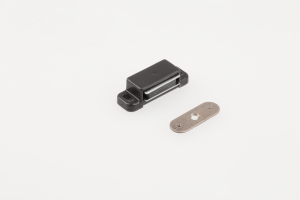 Möbelmagnet in weißer oder brauner Farbe für Schränke. Das Gehäuse besteht aus Kunststoff. Das Set enthält auch eine Platte, die den Magneten nach dem Schließen der Front hält.