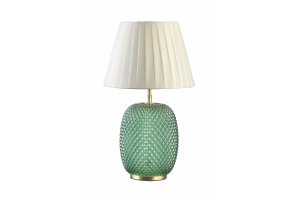 Die Tischleuchte aus der Muno-Kollektion wurde für raffinierte Arrangements im Glamour-Stil geschaffen. Sie ergänzt ihren Glanz und passt perfekt zum ornamentalen Charakter solcher Interieurs. Geprägtes Glas in eleganten Rauten, plissierter Stoff und Ergänzungen aus glänzendem Metall bilden ein bemerkenswertes Ganzes, das auch bei ausgeschalteter Tischleuchte einen schönen dekorativen Akzent in einem eleganten Raum setzt. Drei Farben stehen zur Auswahl: glänzendes Beige, gedämpftes Anthrazitgrau und tiefes Grün.