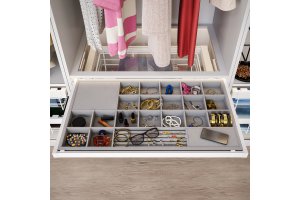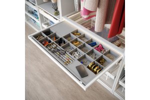 Die ELITE Schmuckschublade hat eine weiche Samtpolsterung und viele Fächer, dank denen sie den Schmuck vor Beschädigungen schützt und für Ordnung sorgt. Kleinere Fächer eignen sich perfekt für die Aufbewahrung von Ohrringen und Ringen, während größere problemlos Accessoires wie Haarschmuck oder Sonnenbrillen aufnehmen. Der Organizer ist in zwei Farbvarianten und vier Größenvarianten mit der Möglichkeit erhältlich, die Breite an den Körper anzupassen. Leise Schließtechnik und Vollauszug erleichtern den täglichen Gebrauch der Schublade. Das Kit ist mit zwei Teilen Bodenmontageführungen, zwei Stück Führungsschutz, zwei Teilen Korbmontage, einem Rahmen mit einstellbarer Breite +/- 58 mm, einer Schublade mit Trennwänden und Schrauben ausgestattet.