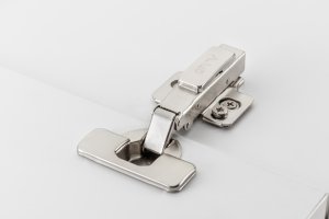 Scharnier mit Dämpfung und Exzenterverst. an Arm und Montageplatte, Innenanschlag, H=0, o.Euroschr.
