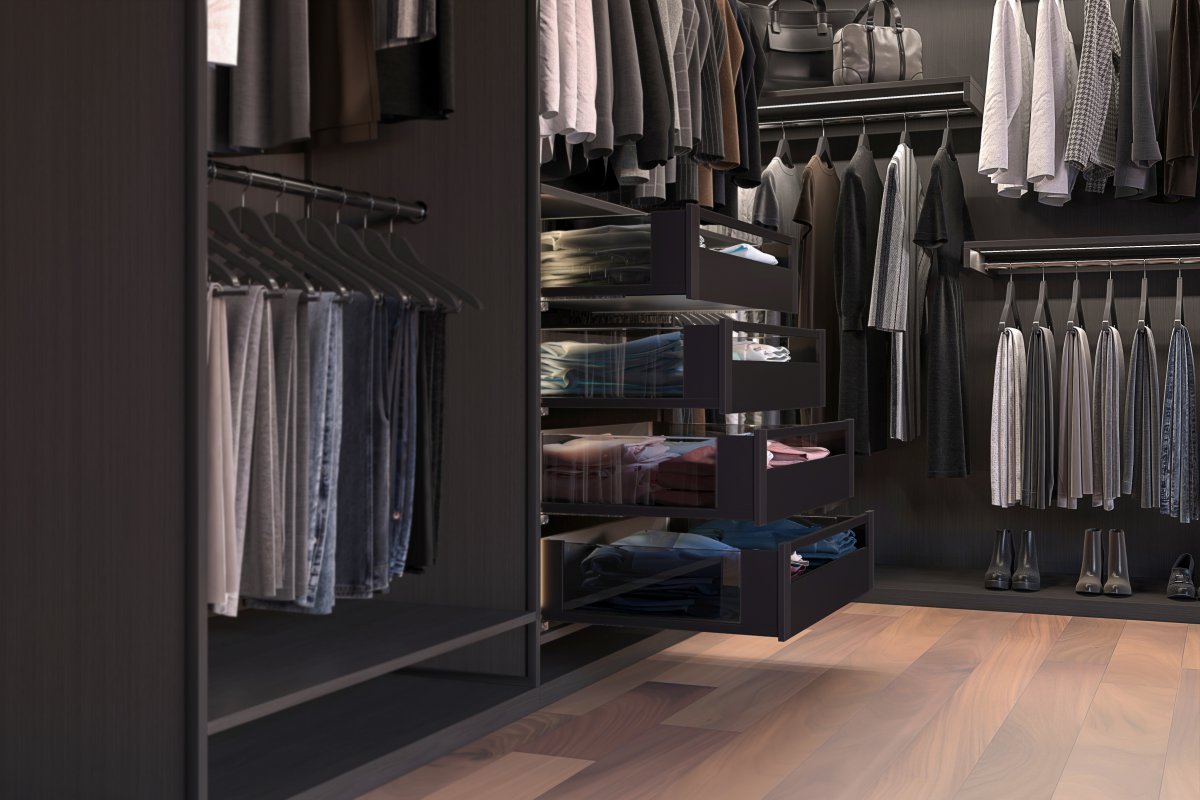 AXIS PRO drawer with glass sides has a long service life of 60,000 cycles. It provides full extension in lengths from 300 to 550 mm, and the soft-close mechanism guarantees quiet operation and smooth closing of the drawer. 3 height variants will make it perfectly match to your interiors. The glass sides of AXIS PRO drawers are tempered glass that is resistant to damage and easy to clean. The drawer side, which is only 14 mm wide, allows maximum use of the inner space of the furniture. The load of the drawer allows you to place up to 40 kg of various products in it. AXIS PRO drawers with glass sides are based on AXIS PRO soft-close runners. Installation is easy thanks to the convenient adjustment from the inside, tilt adjustment and horizontal adjustment in the range of +- 2 mm. The drawer fits a whole range of space organisation systems, cutlery inserts, mats and waste sorters.