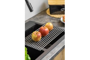 Izrađen od visokokvalitetnog nehrđajućeg čelika, smotani odvodnik na jednoj razini poboljšat će ergonomiju i udobnost pranja. Ujednačena boja brušenog čelika s crnim dodacima i univerzalnom veličinom učinit će ga savršeno uklopiti u unutrašnjost svake kuhinje. Osim toga, rubovi izrađeni od silikona jamčit će stabilnost i pružiti mogućnost rezanja odvodnjaka koji se sastoji od 28 šipki prema vlastitim potrebama.