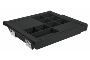 Szuflada ELITE na biżuterie posiada miękką, aksamitną wyściółkę i wiele przegród, dzięki czemu chroni biżuterię przed uszkodzeniami i zapewnia porządek. Mniejsze przegródki są doskonałe do przechowywania kolczyków i pierścionków, natomiast większe z łatwością pomieszczą takie akcesoria jak ozdoby do włosów lub okulary przeciwsłoneczne. Organizer dostępny jest w dwóch wariantach kolorystycznych oraz czterech wariantach rozmiarowych z możliwością dostosowania szerokości do korpusu. Technologia cichego domyku oraz pełny wysuw ułatwia codzienne użytkowanie szuflady. Zestaw jest wyposażony w dwie sztuki prowadnic dolnego montażu, dwie sztuki osłon prowadnicy, dwie sztuki mocowania kosza, ramę z regulacją szerokości +/- 58 mm, szufladę z przegrodami oraz wkręty.