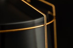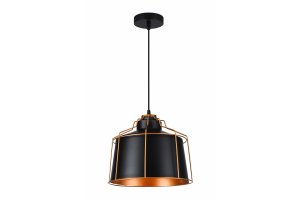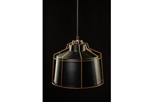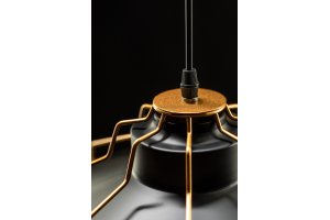 Efektowny wygląd tej lampy został zbudowany na zasadzie kontrastów. Klasyczny, lekko rozszerzający się ku dołowi, czarny klosz okryty jest ozdobnym złotym stelażem