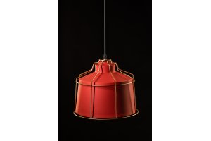 Efektowny wygląd tej lampy został zbudowany na zasadzie kontrastów. Klasyczny, lekko rozszerzający się ku dołowi, czerwony klosz okryty jest ozdobnym złotym stelażem