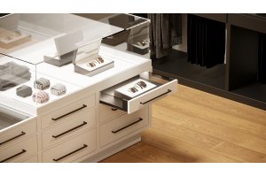 Szuflada AXIS PRO ze szklanymi bokami charakteryzuje się wysoką trwałością certyfikowaną na 60 000 cykli. Zapewnia pełny wysuw w długościach od 300 do 550 mm, a mechanizm cichego domyku gwarantuje cichą pracę i płynne zamykanie szuflady. 3 warianty wysokości sprawią, że idealnie dopasujesz ją do swoich wnętrz. Szklane boki szuflad AXIS PRO to szkło hartowane, odporne na uszkodzenia i łatwe do czyszczenia. Bok szuflady o szerokości tylko 14 mm umożliwia maksymalne wykorzystanie wewnętrznej przestrzeni mebla. Obciążenie szuflady pozwala na umieszczenie w niej aż 40 kg różnych produktów. Szuflady AXIS PRO ze szklanymi bokami bazują na prowadnicach AXIS PRO z cichym domykiem. Montaż jest łatwy dzięki komfortowej regulacji od wewnętrznej strony, regulacji pochylenia oraz regulacji poziomej w zakresie +- 2 mm. Do szuflady pasuje cała gama systemów organizacji przestrzeni, wkładów na sztućce, mat oraz sortowników na odpady.