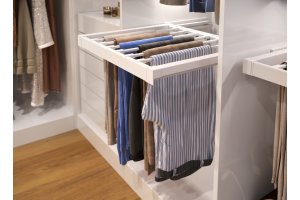 Szuflada ELITE wieszakowa zapewnia miejsce do przechowywania spodni. Jest niezwykle praktyczna za sprawą wielu przegródek. Dostępna w dwóch wariantach kolorystycznych oraz czterech wariantach rozmiarowych z możliwością dostosowania szerokości do korpusu. Technologia cichego domyku oraz pełny wysuw ułatwia codzienne użytkowanie szuflady. Zestaw jest wyposażony w dwie sztuki prowadnic dolnego montażu, dwie sztuki osłon prowadnicy, dwie sztuki mocowania kosza, ramę z regulacją szerokości +/- 58 mm, drążki druciane (6, 7, 8, 9 szt. w zależności od rozmiaru) oraz wkręty.