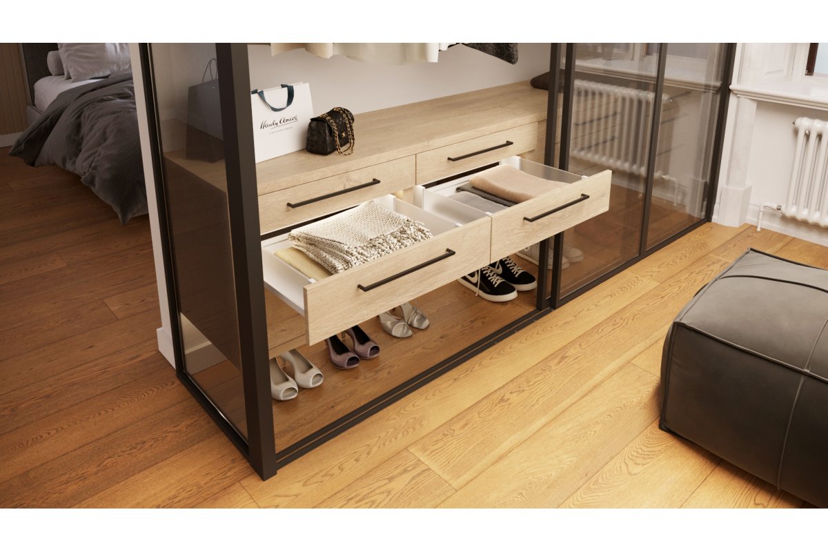 Szuflada AXIS PRO ze szklanymi bokami charakteryzuje się wysoką trwałością certyfikowaną na 60 000 cykli. Zapewnia pełny wysuw w długościach od 300 do 550 mm, a mechanizm cichego domyku gwarantuje cichą pracę i płynne zamykanie szuflady. 3 warianty wysokości sprawią, że idealnie dopasujesz ją do swoich wnętrz. Szklane boki szuflad AXIS PRO to szkło hartowane, odporne na uszkodzenia i łatwe do czyszczenia. Bok szuflady o szerokości tylko 14 mm umożliwia maksymalne wykorzystanie wewnętrznej przestrzeni mebla. Obciążenie szuflady pozwala na umieszczenie w niej aż 40 kg różnych produktów. Szuflady AXIS PRO ze szklanymi bokami bazują na prowadnicach AXIS PRO z cichym domykiem. Montaż jest łatwy dzięki komfortowej regulacji od wewnętrznej strony, regulacji pochylenia oraz regulacji poziomej w zakresie +- 2 mm. Do szuflady pasuje cała gama systemów organizacji przestrzeni, wkładów na sztućce, mat oraz sortowników na odpady.