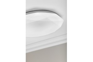 Продуманный дизайн кажется предельно простым. При диаметре 51 см высота плафона составляет всего 11 см. Скошенные по геометрическим линиям стороны придают плафону интересную выразительность. Все это на потолке выглядит очень нежно и является изящным украшением комнаты.