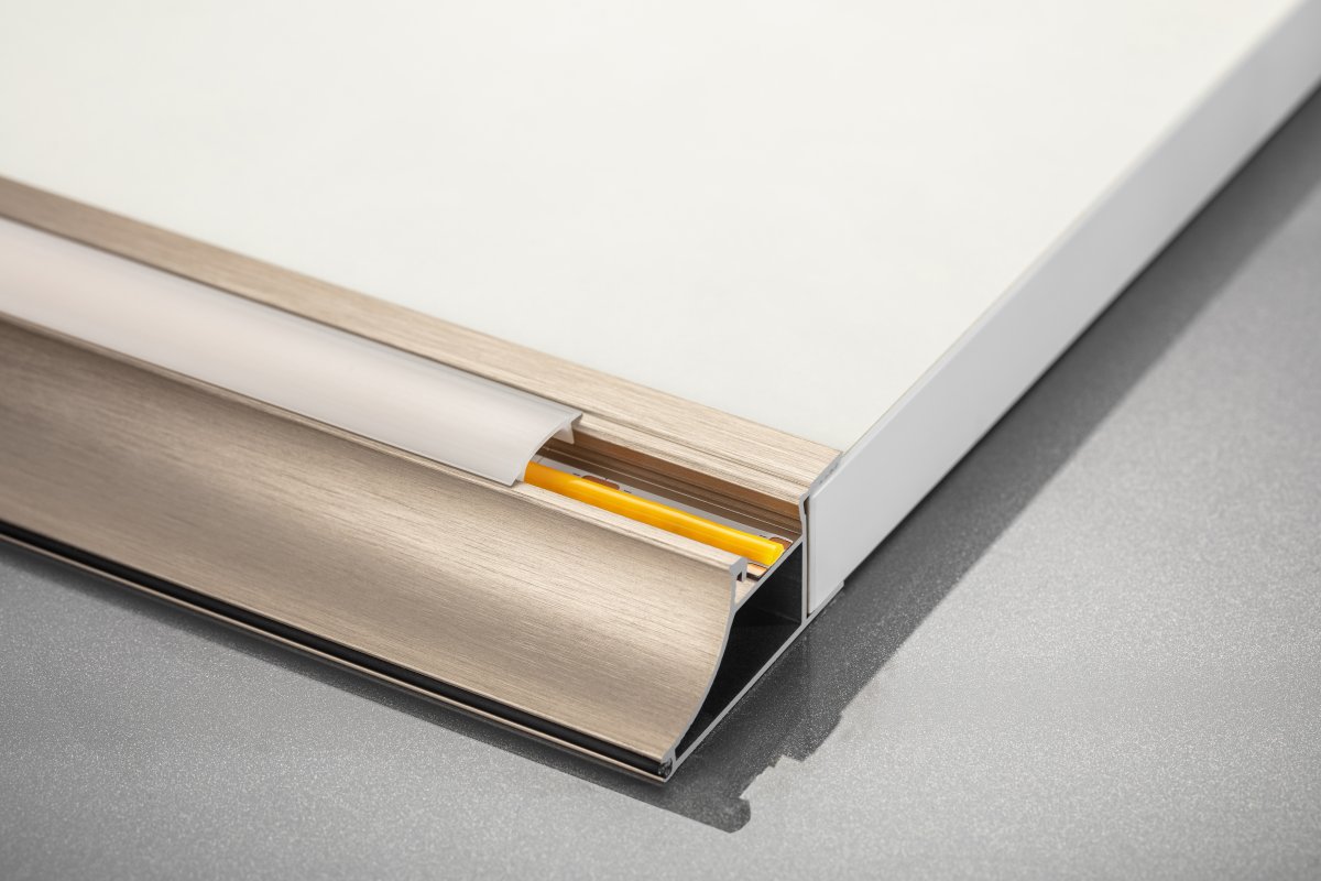 Hladkú líniu skrinky je možné dosiahnuť namontovaním korunkového profilu GLAX na spodný okraj. Je to produkt dva v jednom, ktorý nahrádza rukoväť a zároveň osvetľuje dosku.